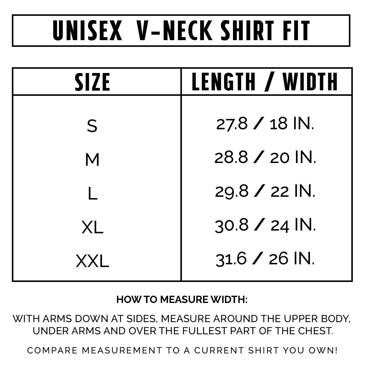 Details: Triblend Fit: Unisex Style: V-neck short sleeve t-shirt Shirt Color: Dark Grey Heather Ink Color: White The print is transferred via screen printing onto the shirt providing vibrant look!