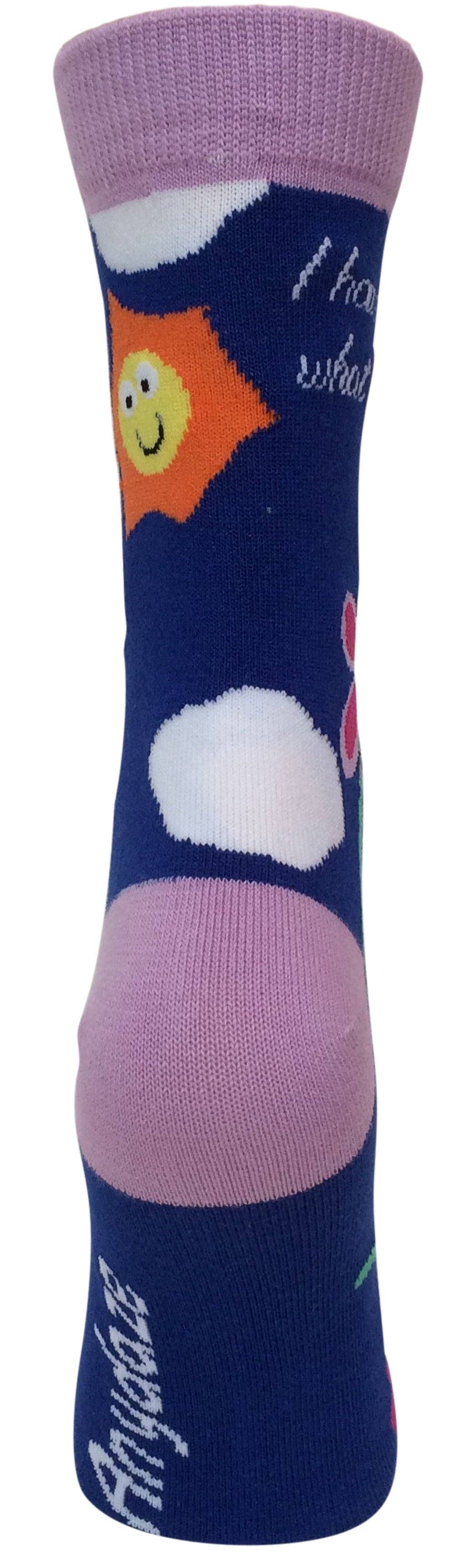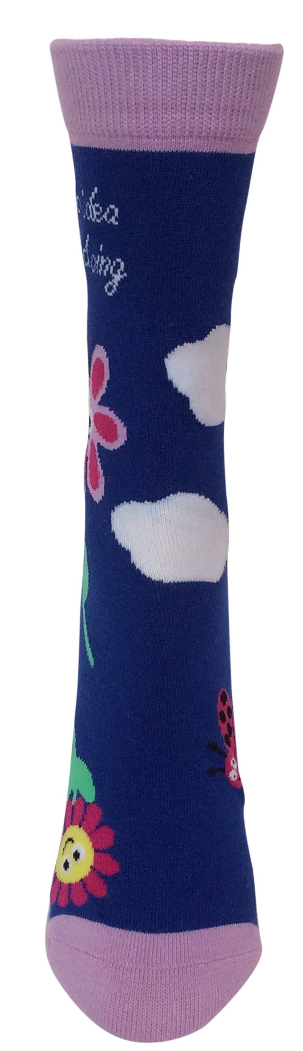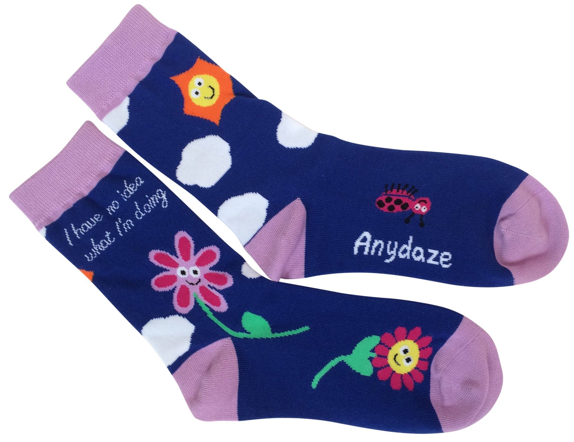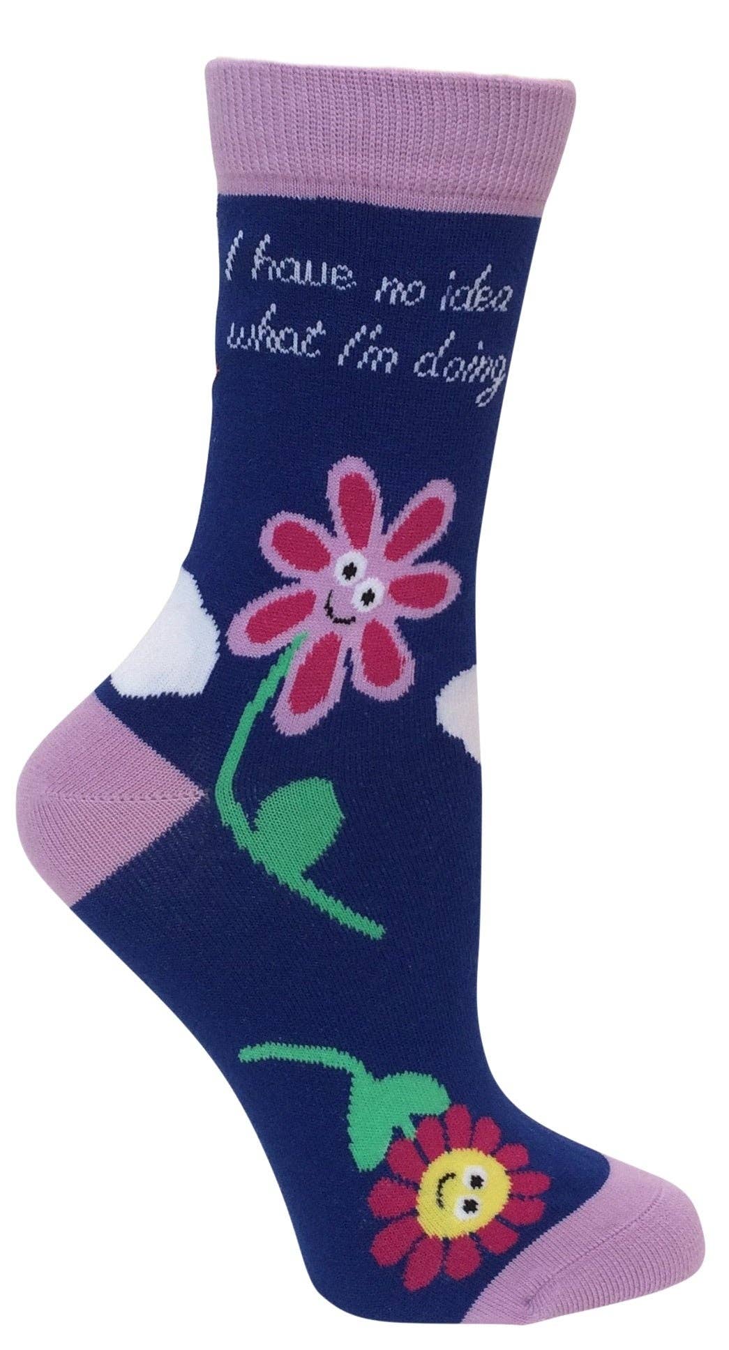 * None of us REALLY know what we're doing. We just don't admit it. Our "I Have No Idea What I'm Doing" socks let you quietly admit it. Deep blue socks with colorful smiling flowers and a ladybug reflect that you gracefully and courageously accept it.