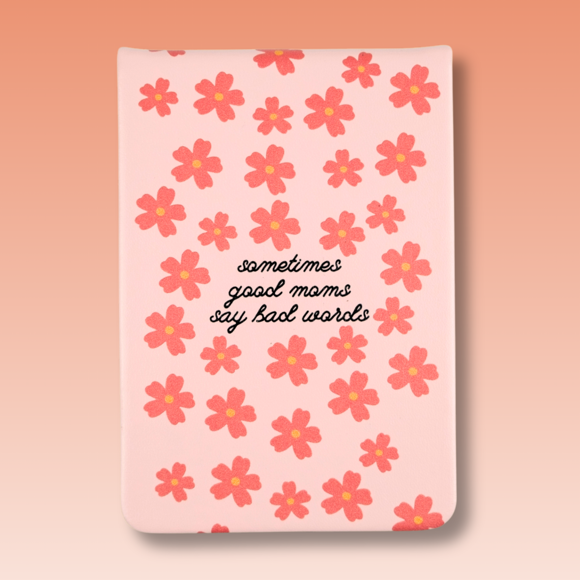 The cover is made of a soft leatherette material and the print is embossed. It reads “Sometimes Good Moms Say Bad Words” in black writing on a light pink background featuring darker pink flowers..